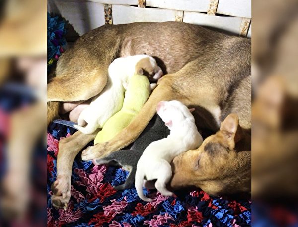综合媒体报导,10月25日,来自菲律宾拉尤尼翁省(La Union Province)的乔娜(Chona Lacsamana)醒来时,发现她的狗狗摩卡(Mocha)和一群新生的小狗睡在一起。这些小狗呈现黑色、白色和棕色等不同颜色,但乔娜从中发现了一只很特殊的小狗,它似乎是浅绿色的。