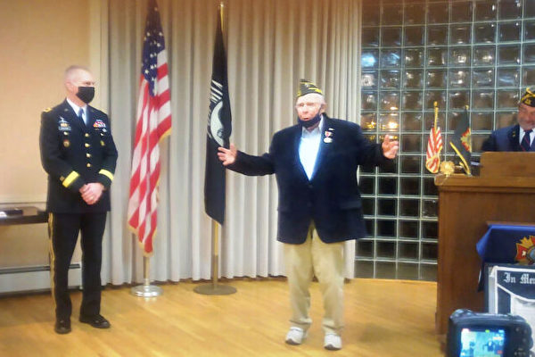 在授勋仪式上,虽然他戴着口罩,他的眼睛眯着、微笑着,他终于收到了他的三枚第二次世界大战作战勋章。