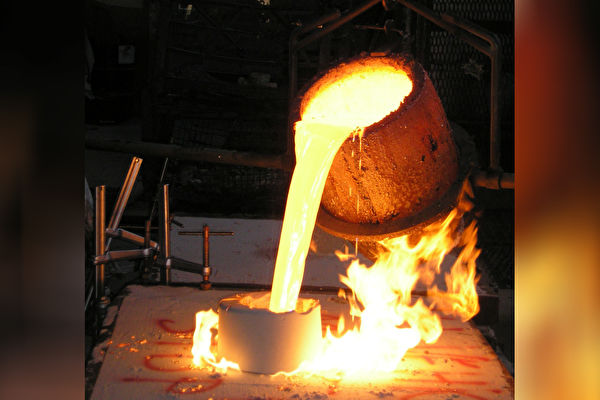 网上一段影片显示,一名看起来像冶炼厂工人的男子,先用铁棒将熔炉通道清理一下,让熔化的液态金属可以顺畅地往下流。