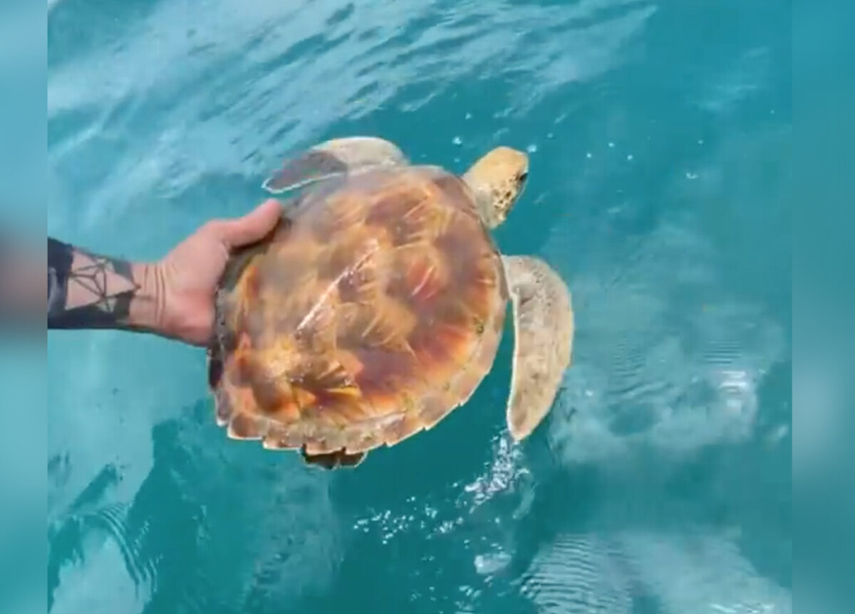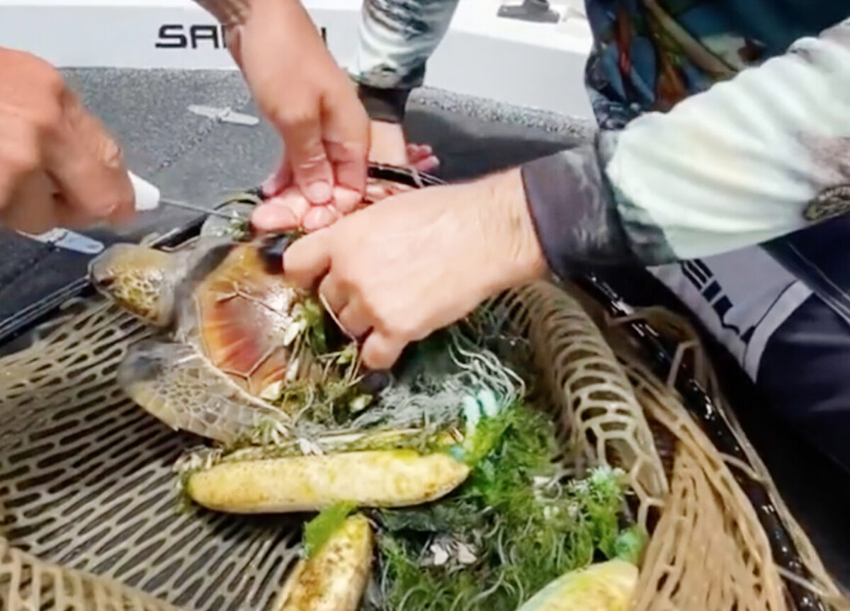 希勒说:“我们看到有东西在动,原来是一只小海龟被缠在里面。”令人震惊的是,那只可怜的小海龟的四肢都被紧紧缠住,它不停地挣扎,但根本无法逃脱。