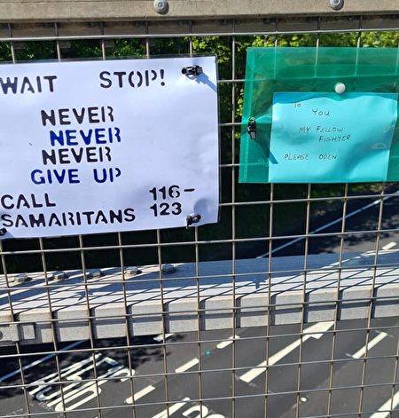 英国德比市 (Derby)的一名男子赋予自己一项使命,他在德比郡(Derbyshire)全县的15座桥上都挂上了一块劝告“切勿自杀”的牌子,并留下了一封温馨的亲笔信,成功挽救了7条生命。