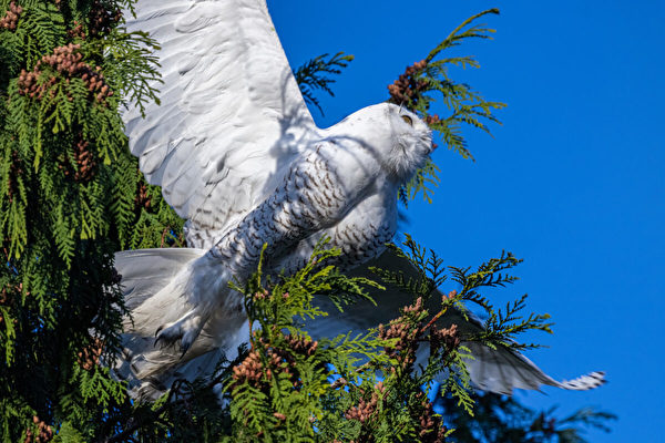 据了解,这种白色猫头鹰的学名叫雪鸮(Snowy owl),是一种猛禽,属于体形较大的鸮类,因全身几乎为雪白色而得名,而且它们多为昼行性鸟类,因此是很有特点的一种猫头鹰。