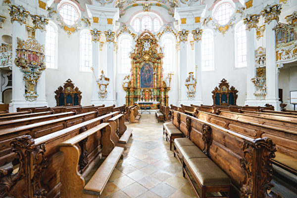 维斯朝圣教堂(The Pilgrimage Church of Wies)位于德国巴伐利亚州的一个乡村,是洛可可艺术的完美杰作,因相传教堂内的救世主像曾落泪而成为圣地,其室内装潢相当出色,1983年被列为世界文化遗产。