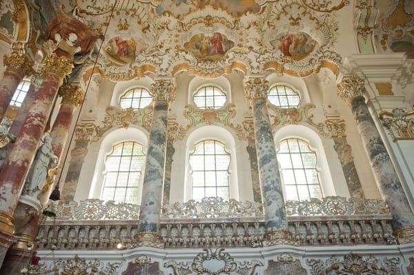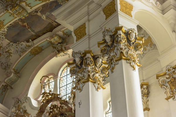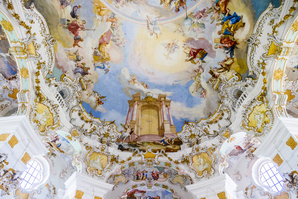 多米尼库斯用灰泥塑成的繁复线条以及他的哥哥绘制的天花板壁画,构成了教堂华丽而明快的内部装饰,其中蕴含的工艺水准和艺术价值无与伦比。华丽镶金的泥塑花环、举世闻名的教堂圆顶天花板壁画、精雕细琢的立体感强而逼真的错视画(trompe l’oeil),都是反映了人类最高创造力的大师级作品,是虔诚信仰的最佳见证。
