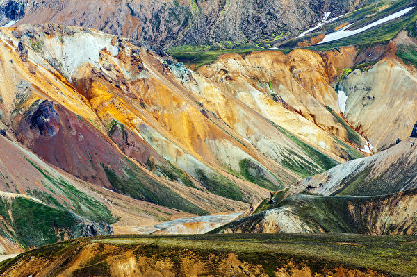 位于冰岛壮丽的高地,兰德曼纳劳卡(Landmannalaugar)地区有一些世界上最出众的五彩山峦。它们丰富的色彩包括鲜艳的蓝色、黄色、紫色,甚至粉红色。这些山脉由流纹岩(一种熔融的火山岩)组成。
