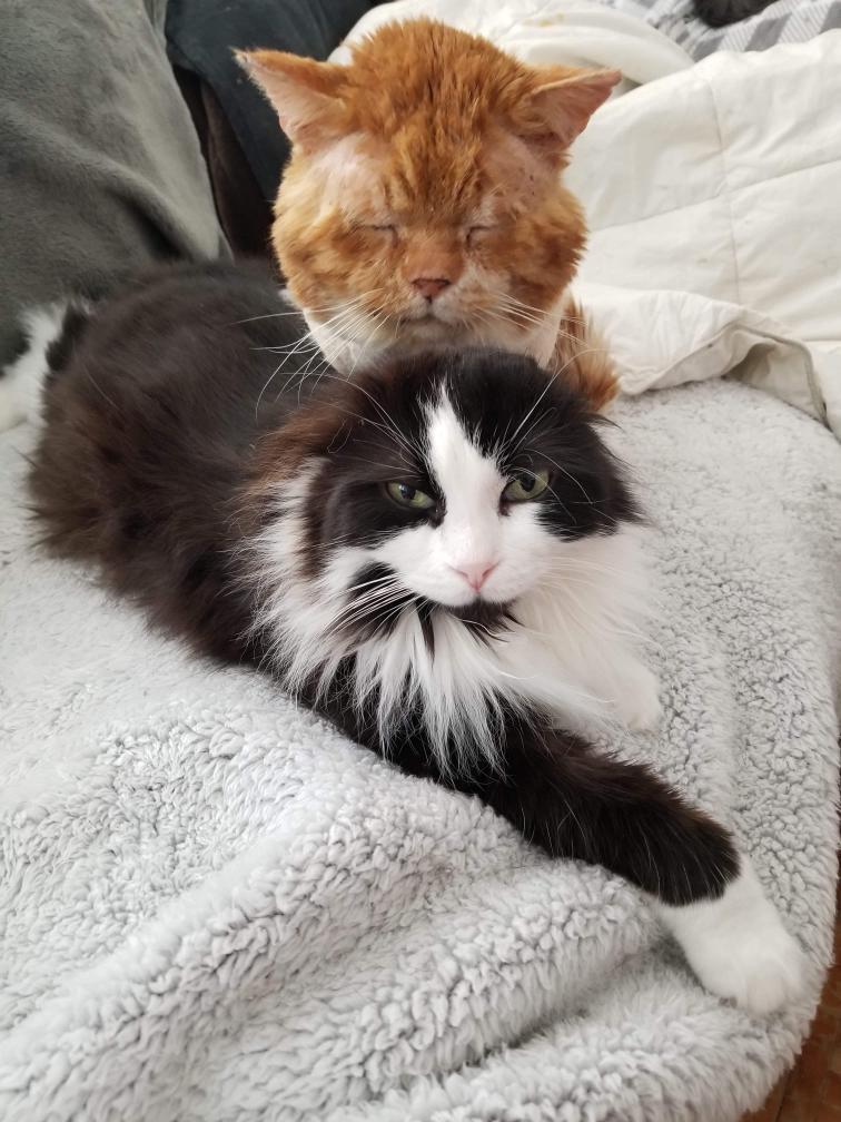 确定大橘是没有人要的猫猫后,杰勒决定先把它寄养在家里,恢复健康后,再为它找领养人。杰勒家里有一只土着长毛奶牛猫克莱奥(Cleo),原本还担心两只猫关系不和。没想到大橘到家后,跟奶牛猫相处得很好,跟老朋友见面似的。寒冷的冬天,两只猫经常靠在一起取暖。