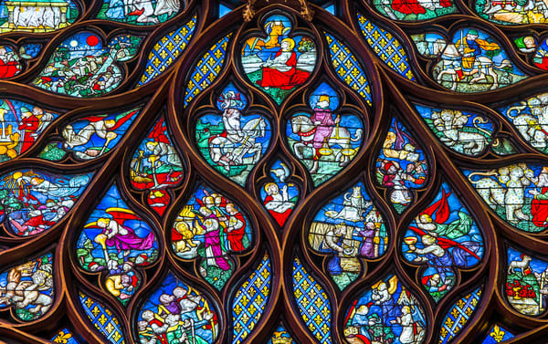仔细观察的话,这些玻璃窗上都是源自《旧约》和《新约》的场景,从创世纪一直到耶稣复活共有1,113幕。