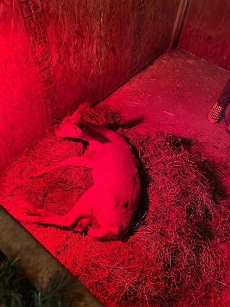 在经过了几个小时的艰苦历程后,凯莉在脸书上写到:“这只卧在稻草床上的小鹿在加热灯下暖和了起来”。
