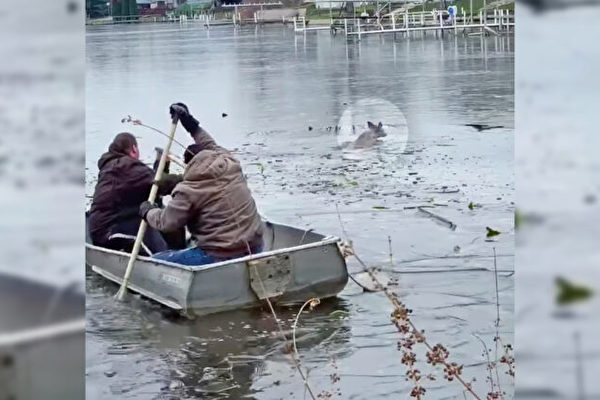 救援队中的两人先乘着划艇靠近这只鹿,用绳子系住它,然后慢慢将它从湖中拉起放到船上,再用毯子裹住它以保持温暖。
