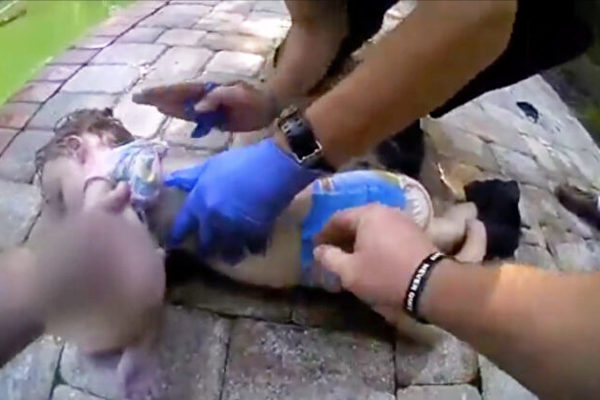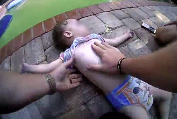 警官斯克珀(Kyle Skipper)第一个赶到,他的随身摄像仪录下的视频显示,他飞速穿过草坪、进入后院,祖母正在尝试给躺在游泳池边的孩子做心脏复苏,但孩子没有任何呼吸。