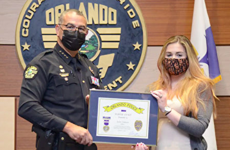 据英文媒体报导,这位来自奥兰多警察局(Orlando Police Department)的警员凯文·瓦伦西亚(Kevin Valencia)在上个月(10月)举行的退休仪式上,获颁一枚紫心勋章、一份城市声明和一块退休纪念匾。由于凯文仍在康复中,他的妻子梅根(Meghan)代表他接受了这些奖项。