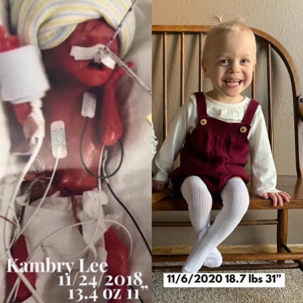 坎布里‧埃沃尔特(Kambry Ewoldt)和基利‧埃沃尔特(Keeley Ewoldt)是一对双胞胎,于2018年11月24日出生。然而,她们的母亲杰德‧埃沃特(Jade Ewoldt)的预产期实际上是2019年3月29日,也就是说在怀孕才第22周左右,她们就早产了。