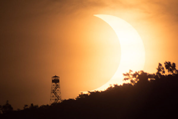 一直以来,戴蒙德有个创作系列,使用纽约州历史悠久的森林火警瞭望塔为主体,再加入不同的天文现象作为陪衬。这次日偏食刚好在日出时分发生,若加上瞭望塔,他相信应该会有不错的效果。于是,他最终选定座落在松树地(Pine Plains)的斯蒂辛山火塔(Stissing Mountain Fire Tower)作为拍摄对象。