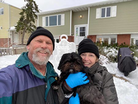 在2020年12月的隆冬时节,在一家门口建造“雪天使”,这是一个多步骤的工程。在一篇帖文中,安迪详细地解释了这个过程,他写道,首先要准备三种直径不同的2英尺高的圆柱形模子,用c形夹子夹住固定,然后把雪填满每个模子并压实。