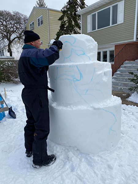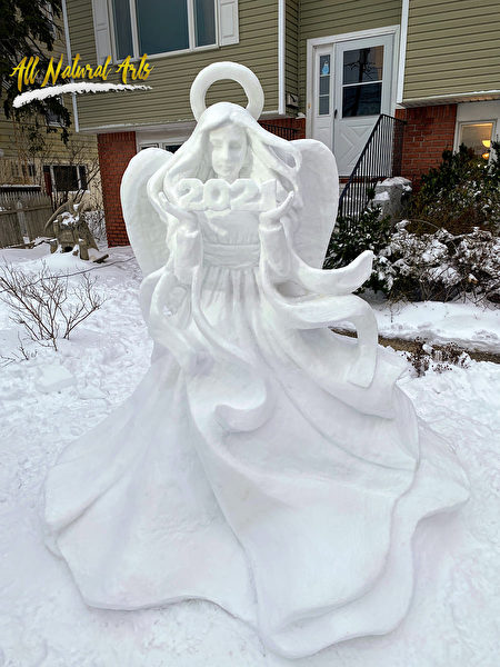 安迪和苏用锯子切出粗略的形状,然后改用更小的工具,包括铲子,来细化。塑造和平滑,直到天使的身影出现,他们为她的翅膀尖端和她的衣服底部添加了一点额外的雪。