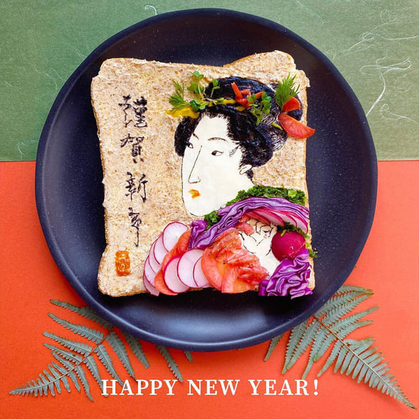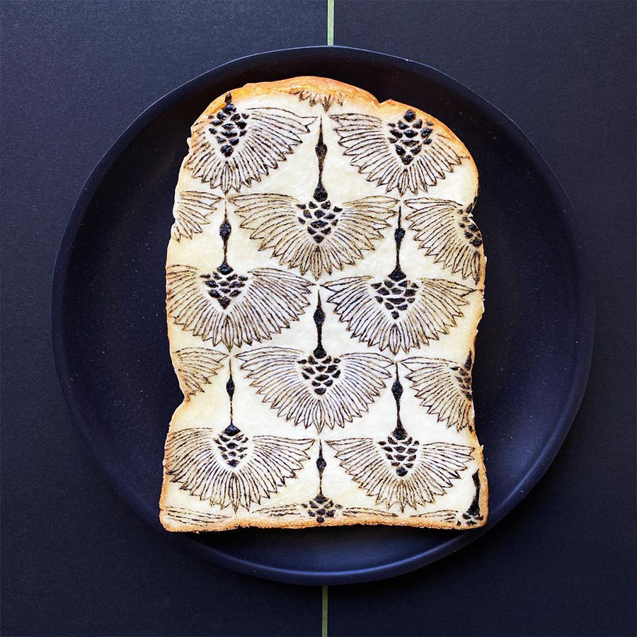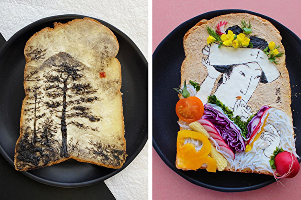 向来喜爱日本文化的她,主要从传统的日本文化中汲取灵感,比如日本浮世绘、山水画作等都在一片片吐司上还原。除此之外,她也挑战日本传统人物、经典杂志封面、漫画、海报等各种图案。