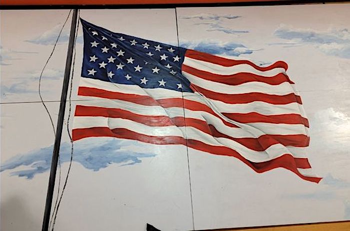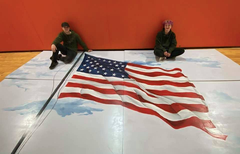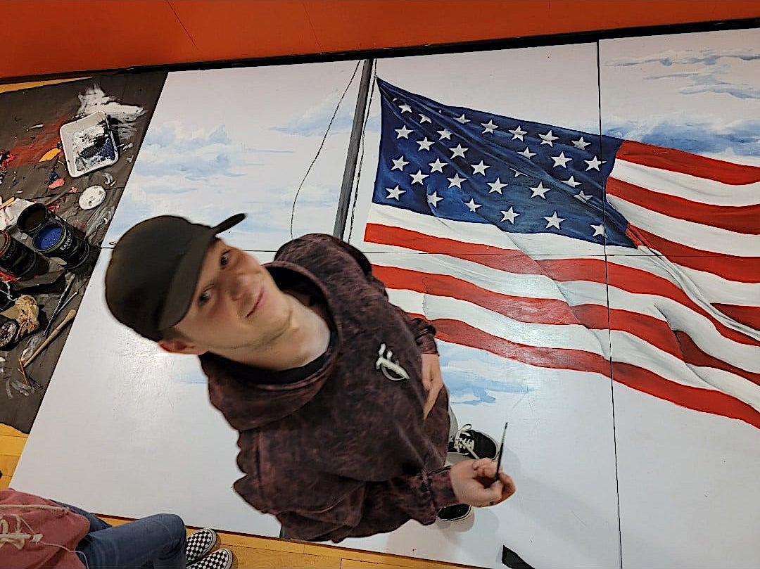 两位美国空军退伍军人的儿子为他的高中绘制了一幅美国国旗的壁画,令他的家乡小镇引以为傲。他花了整整一个学期才完成这幅作品。