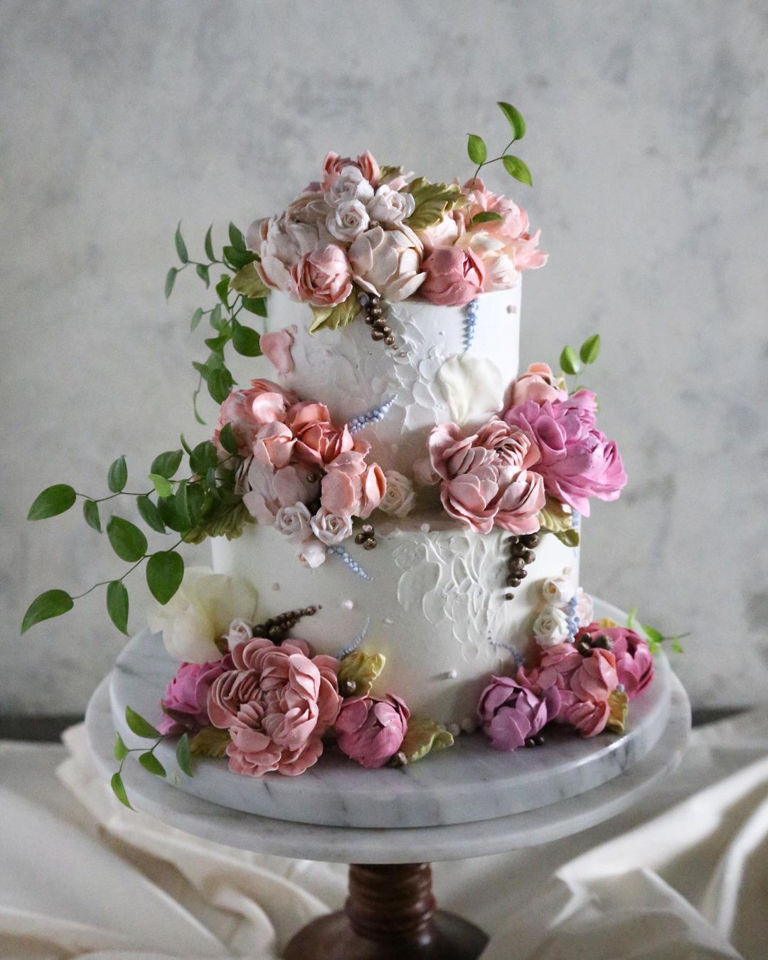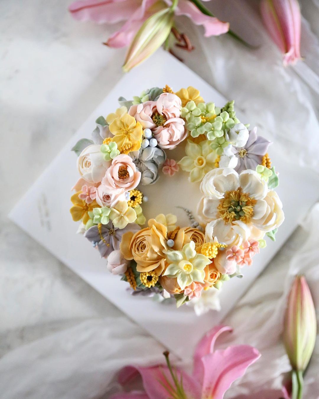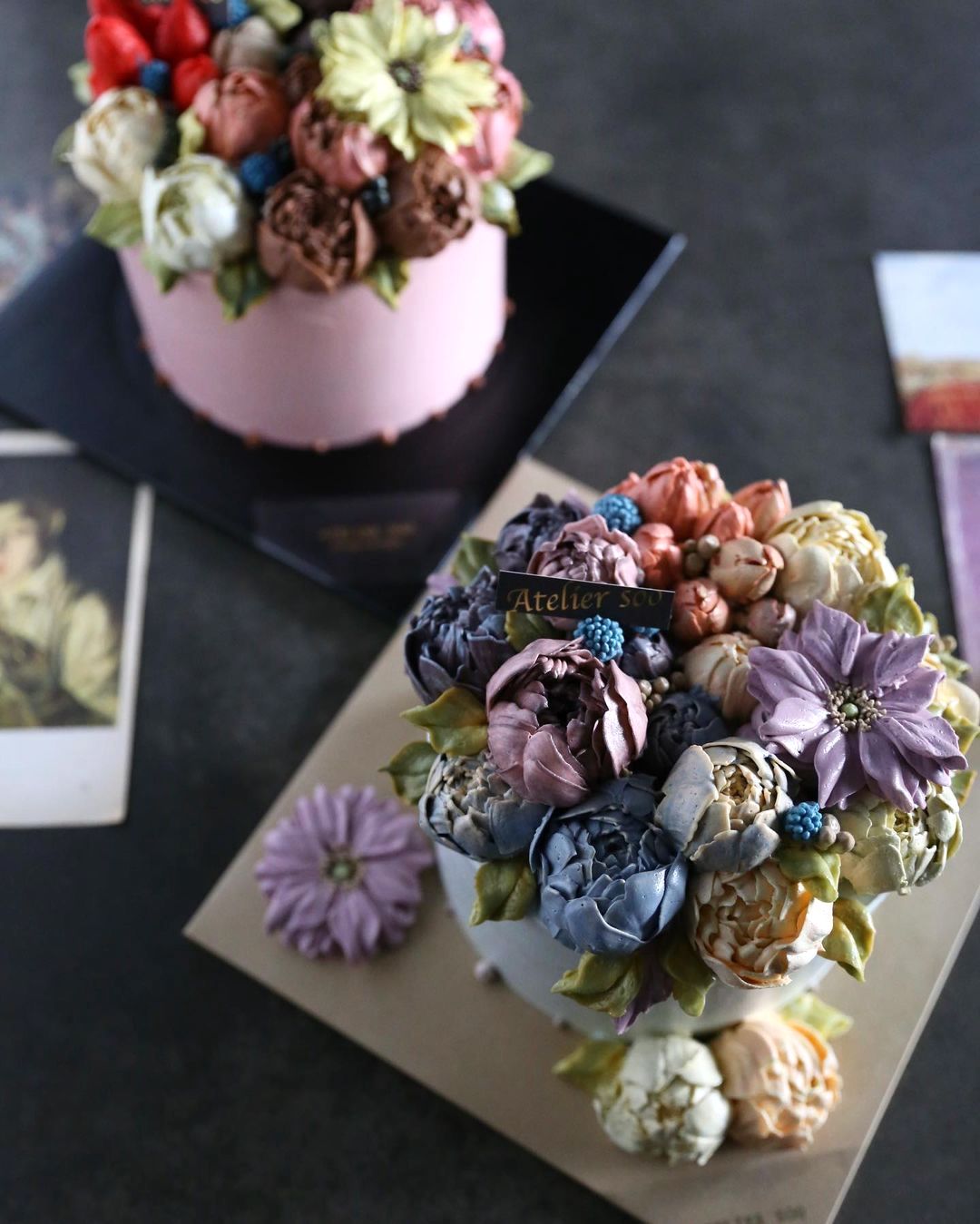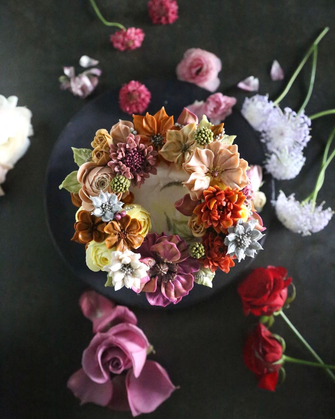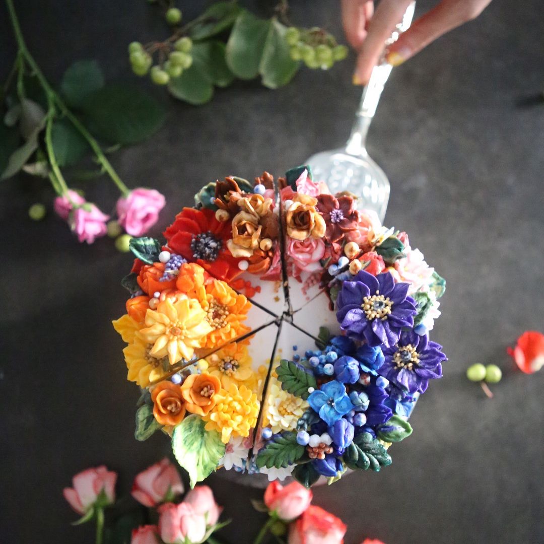 这种蛋糕要求蛋糕师有足够的艺术功底,不管是花朵的配色还是摆位都很讲究,就像花艺一样。