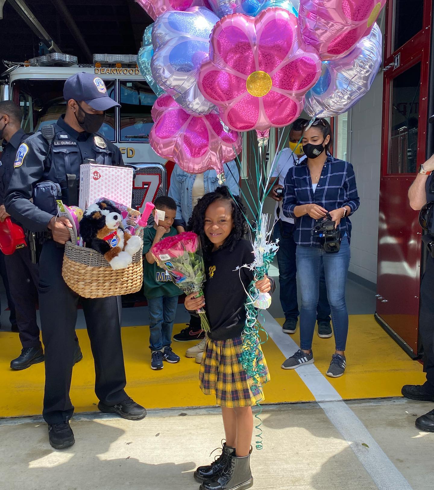 发布的照片显示,这个7岁的小女孩看到警员和急救人员送给她的一大篮子礼物,露出甜美的笑容。