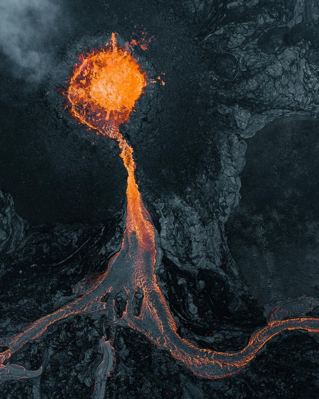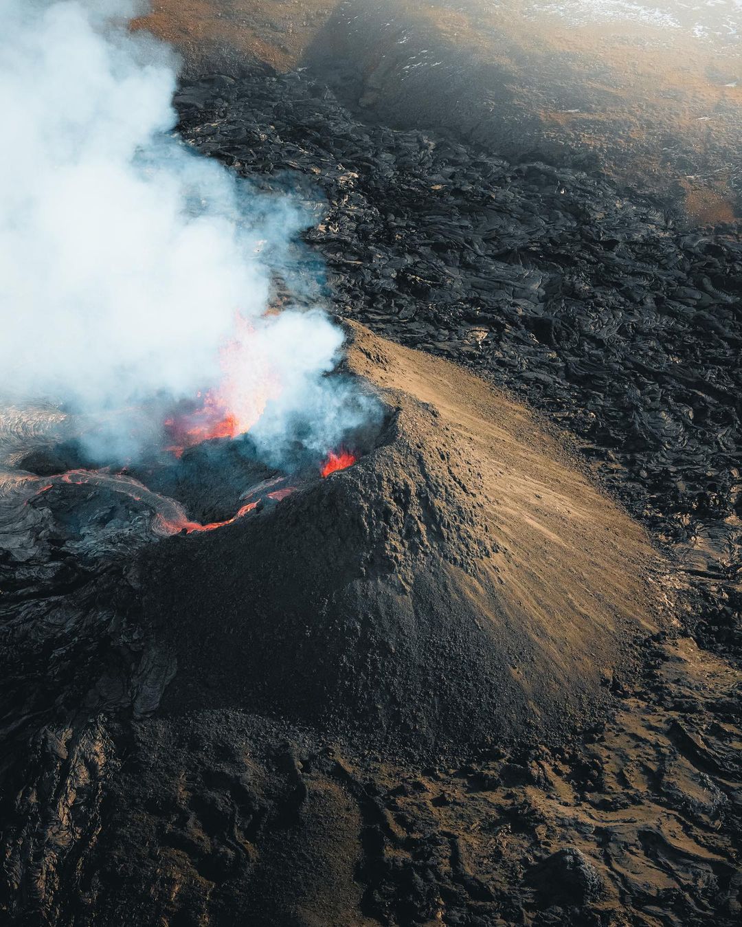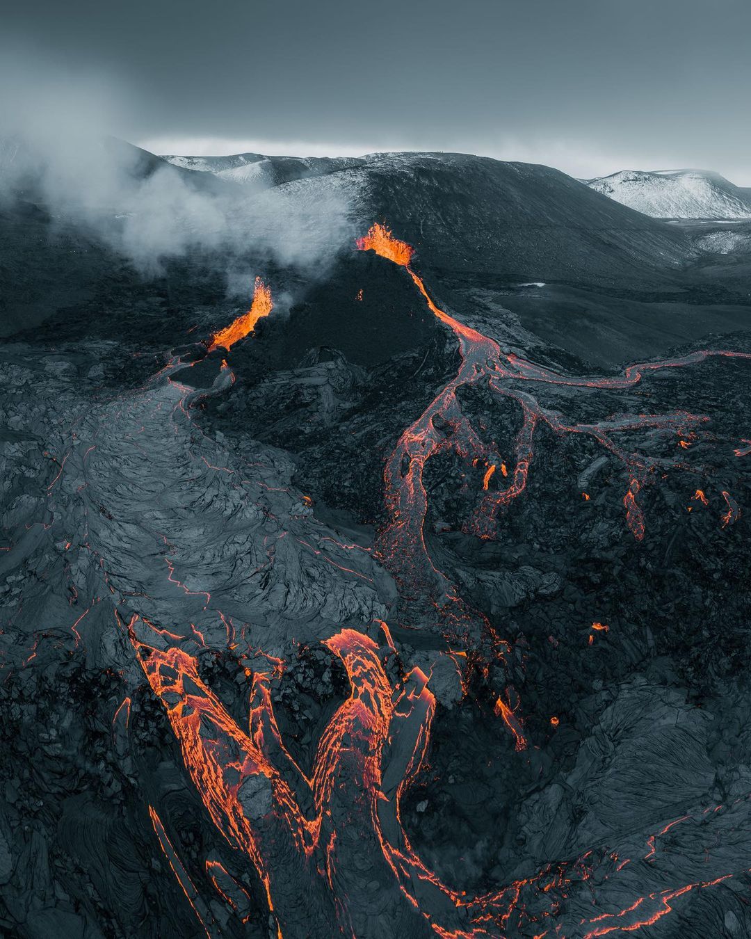 该摄影师描述自己与火山的互动已达到极限,在过去的几天里,他的无人机在喷发点上空几乎被融化了。