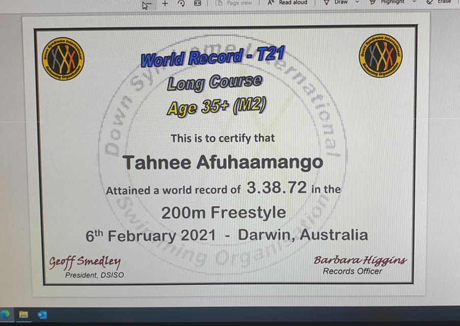 唐娜对澳大利亚广播公司(Australia’s ABC News)说,她当时非常震惊,因为这意味着塔尼的游泳成绩比35岁以上患有唐氏综合症游泳者的世界纪录快了6.64秒,甚至还刷新了大洋洲的纪录。