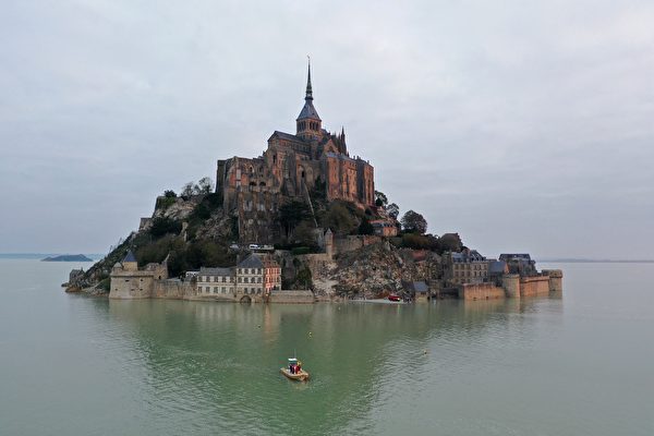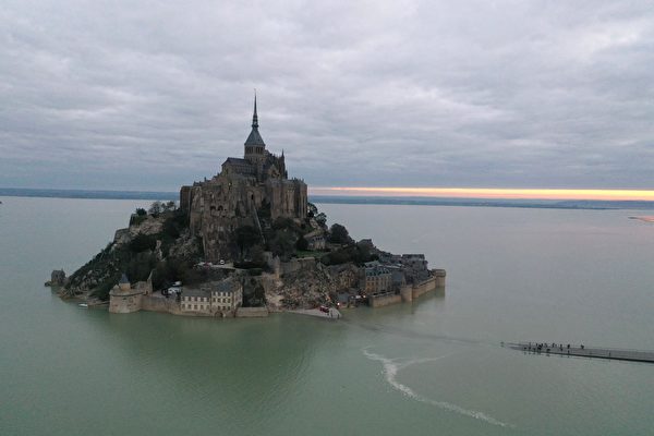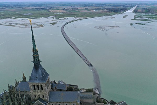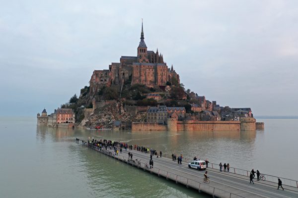 圣米歇尔山每逢涨潮就会暂时变成孤岛,法国当局在2014年新修了一条通行桥,虽然刻意加高高度,旨在让游客在涨潮时也可安全前往游览,不料仍遭海水淹没。
