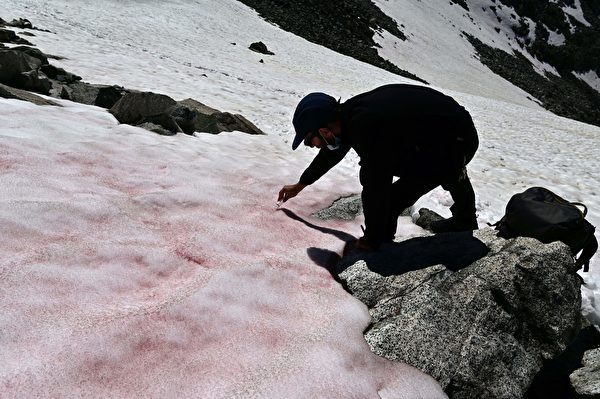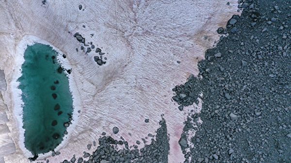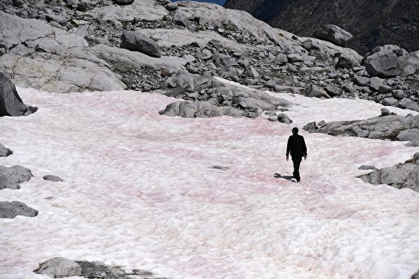 据法新社报导,使普勒塞纳冰川变成粉红色的藻类会使冰川融化得更快。意大利科学家正在调查这些藻类来自何处。