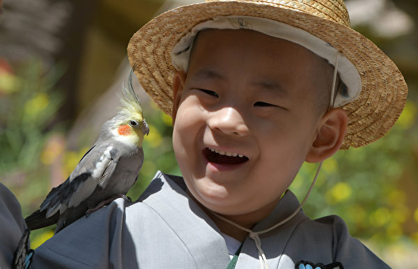 2019年5月2日,一只小鸟停在一名小和尚肩膀上。(JUNG YEON-JE/AFP/Getty Images)以下是这些小和尚出游的影片: