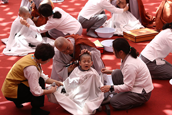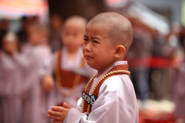 2019年4月22日,一名小和尚在剃度后哭了。(Chung Sung-Jun/Getty Images)