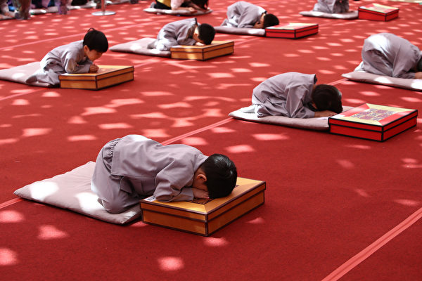 2019年4月22日,这群小和尚在剃度前行礼。(Chung Sung-Jun/Getty Images)