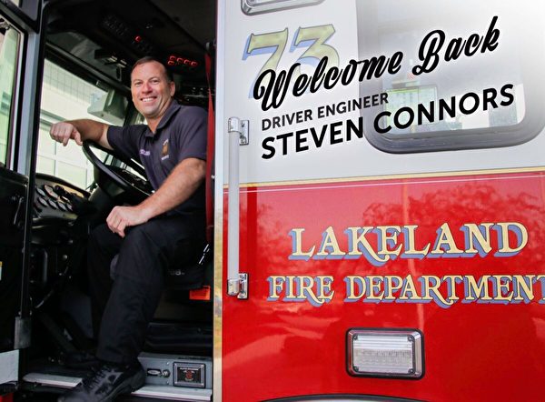 今年10月 27日驾驶工程师史蒂芬康诺斯返回到雷克兰消防队的工作岗位,在他与格林-巴利症候群(Guillain- Barre Syndrome)奋战长达一年之后,他必须从新学习如何吃,如何讲话,如何走路。这是一种身体的免疫系统攻击自身神经,最终造成全身瘫痪的罕见失调症。