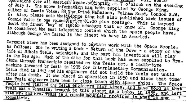 该文件中写道:“宇宙人……告诉我们,特斯拉是金星人,1856年还是婴儿时被带到这个星球,交给现今南斯拉夫一个偏僻山区省分的特斯拉夫妇抚养。”◇