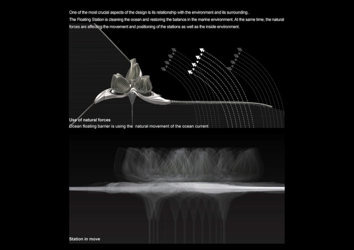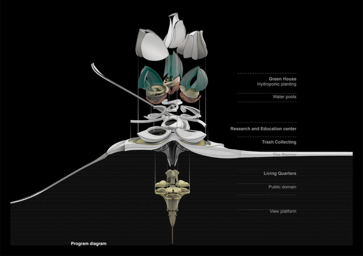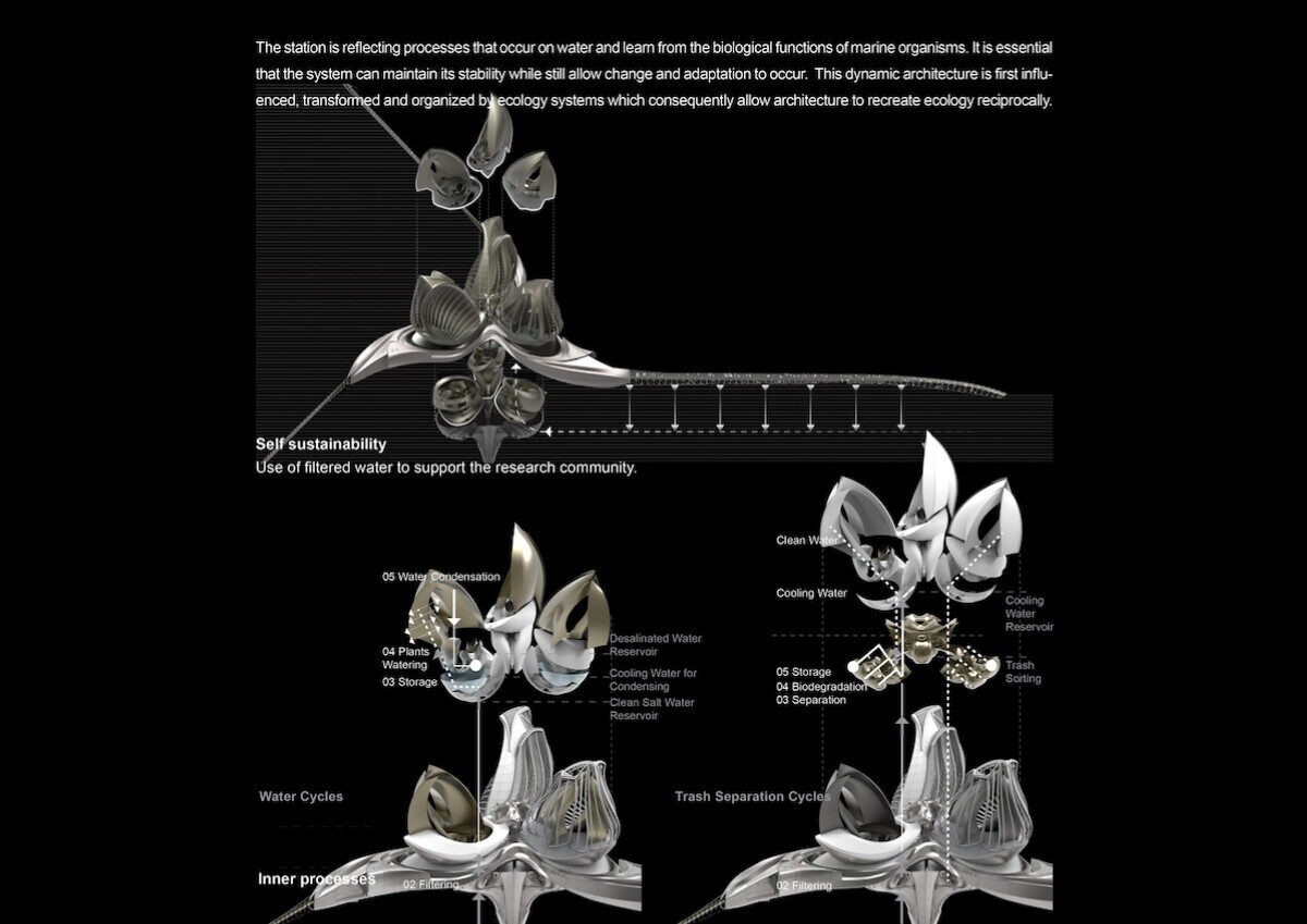 该工作站主要由五个部分组成,包括拦污屏障,用于收集废物并获取潮汐能;收集器,对废物进行分类、生物降解和储存;研究和教育中心,用于学习和展示令人堪忧的水环境问题;温室,用于种植植物和淡化海水;生活区,里面包括一些配套的辅助设施。每个部分都有不同的功能,花瓣状相互连接的建筑系统坐落在触手形的平台上。