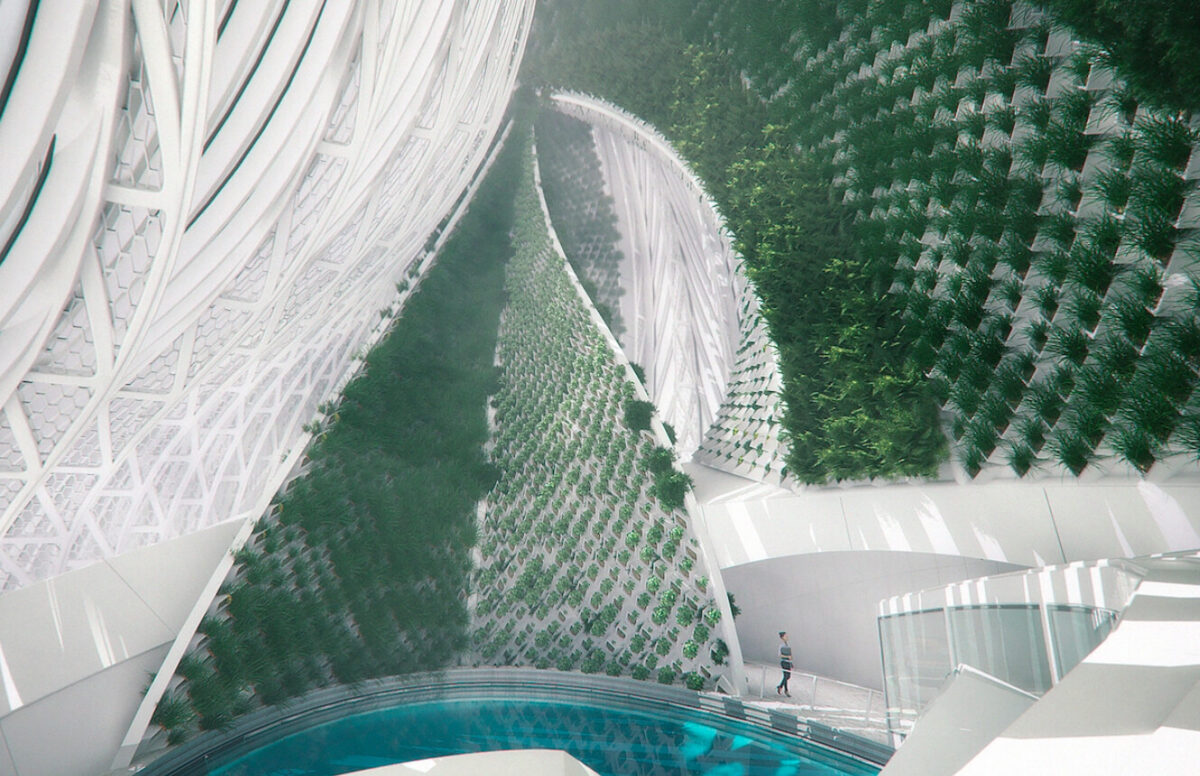 温室的形状是为了优化冷凝水的收集,它还可以通过风来导航漂浮站,像风帆一样。公共空间、生活区和研究设施穿过建筑中心,在几何形状上与船的龙骨相匹配。