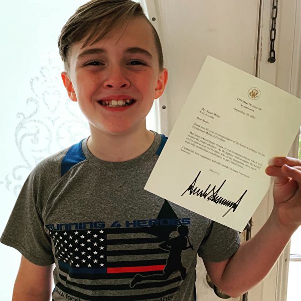 一个来自美国佛罗里达州的十二岁男孩撒迦利亚(Zechariah Cartledge),为了纪念殉职的警察、消防员等,他创建了一个跑步公益组织,并以卓越的成就获得了总统自由勋章。