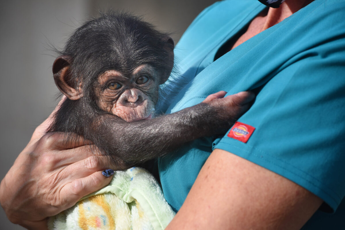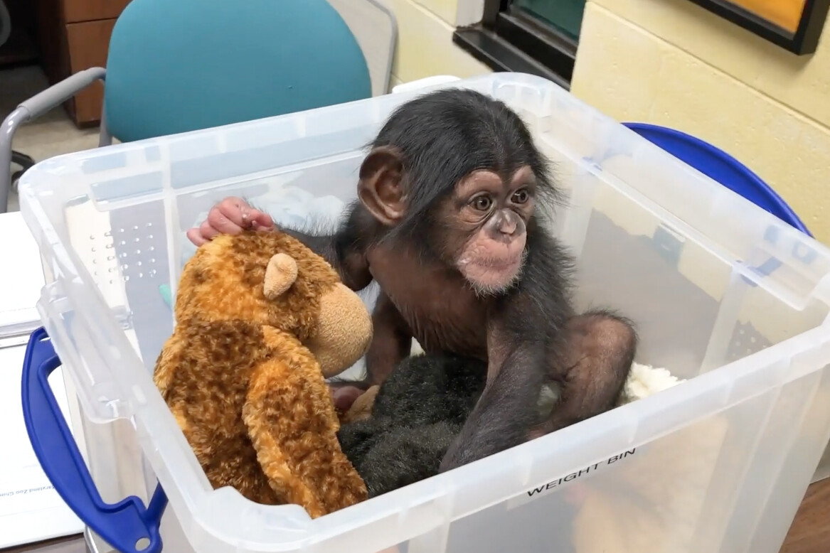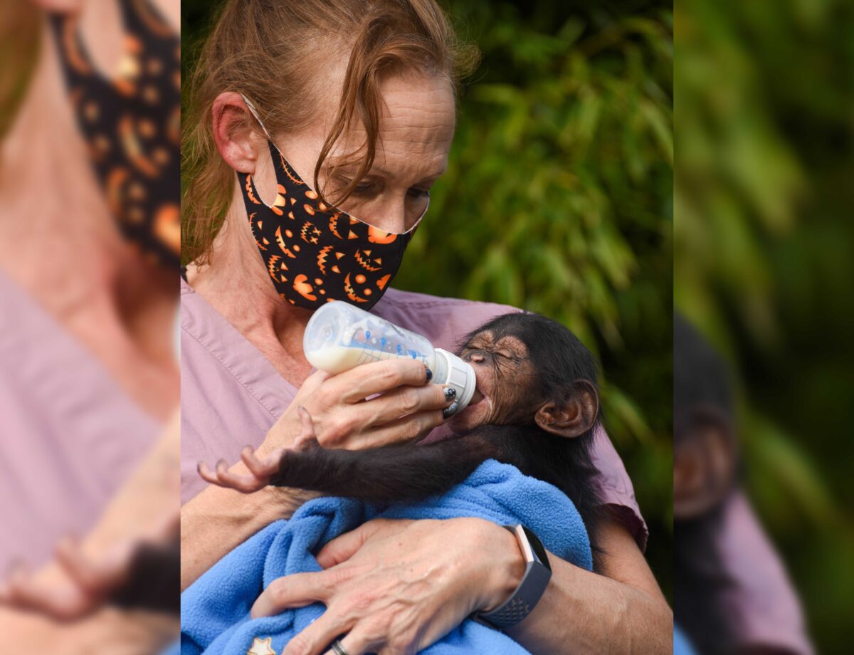 这只黑猩猩宝宝叫Maisie,去年8月28日出生于俄克拉荷马市动物园(Oklahoma City Zoo),出生时体重仅为4磅(约2公斤)。母猩猩生下它后不知何故并不愿意主动抚养它,园方在无可奈何的情况下只能将它送至巴尔的摩动物园,交由专业人士帮忙抚养照料。