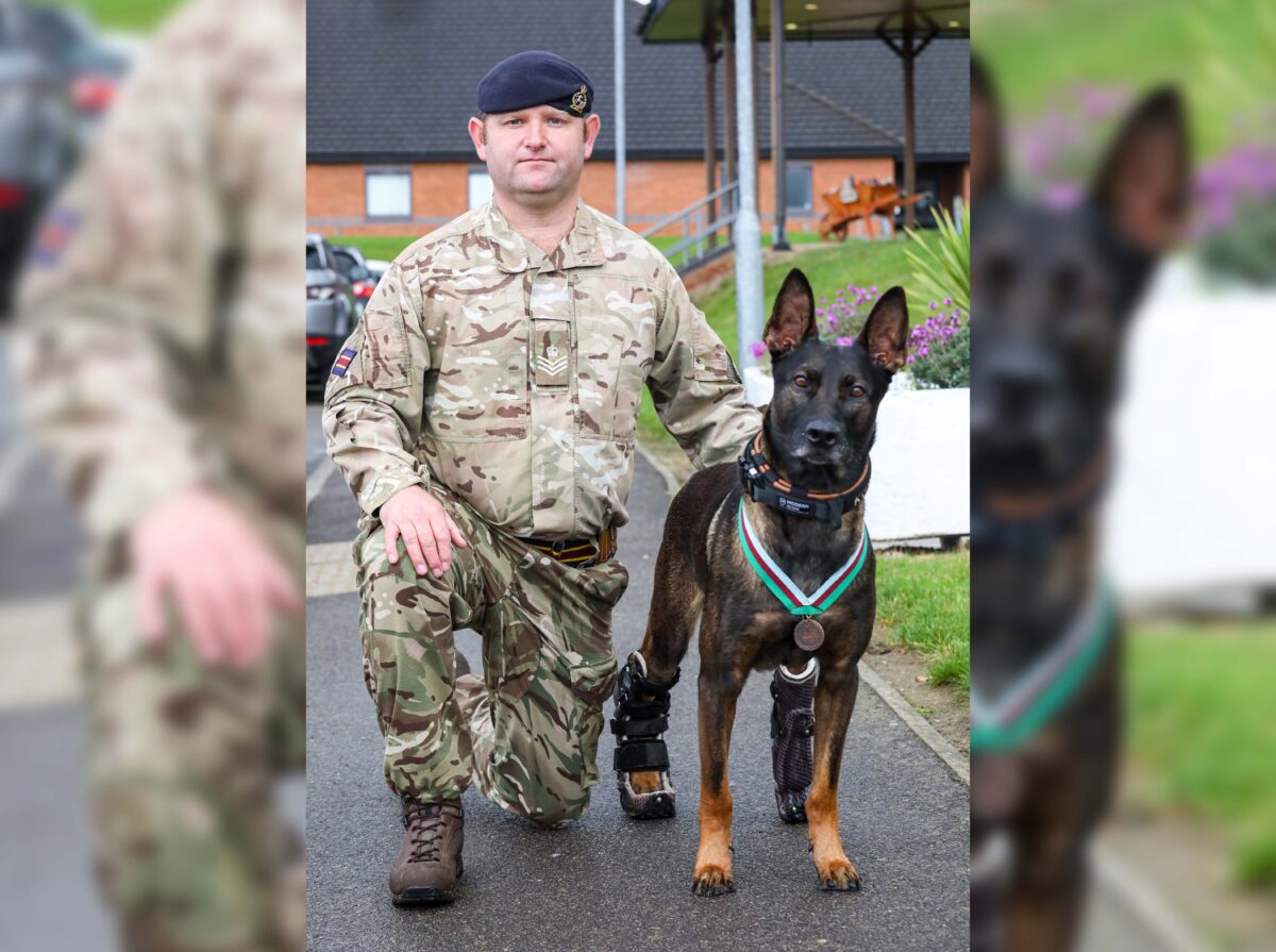 英国侦查军犬库诺(Kuno)在去年的一次突袭中,遭手榴弹和机枪攻击,它英勇地采取行动成功制服了持枪歹徒,使任务顺利完成,同时拯救了英国特种部队的多名士兵。但它也因此后腿中弹截肢,日前它在退休时获颁PDSA迪金勋章。