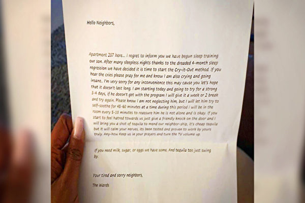 这封信让一位邻居哭了,信上说,新手父母凯莉和马修‧沃德(Kelee and Matthew Ward)正试图用“哭个够”的方法哄他们6个月大的儿子阿特拉斯(Atlas)入睡,而阿特拉斯正与睡眠做斗争。