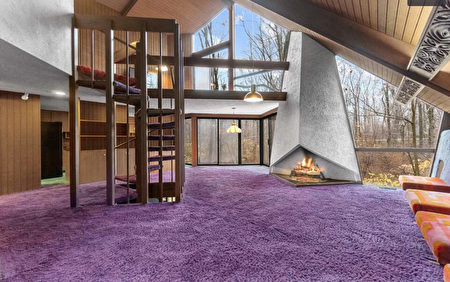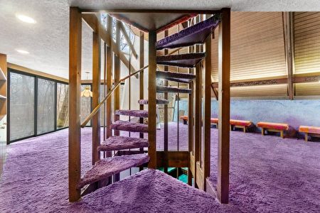 不过,最充满惊喜的是它的内部装潢。总共2千476平方英尺大的屋内空间到处铺满了紫色和绿松色的粗毛地毯,而家电设备则是原封不动的70年代产品。