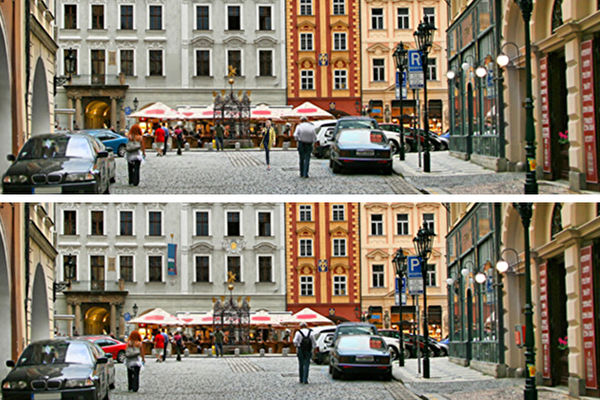 将这两张图片比对一下,可以很明显地看到右侧的黄花和红花的差异。还有街道中少了一个路人与另一个路人多了背包等,这些都是很明显的差异。而几个比较小的细节包括停车标志“P”与“R”的不同,以及背景中的建筑物上出现的金色装饰品等。