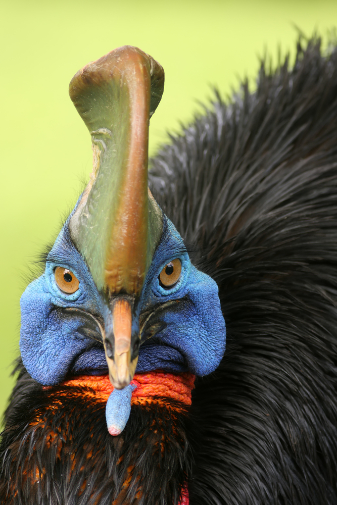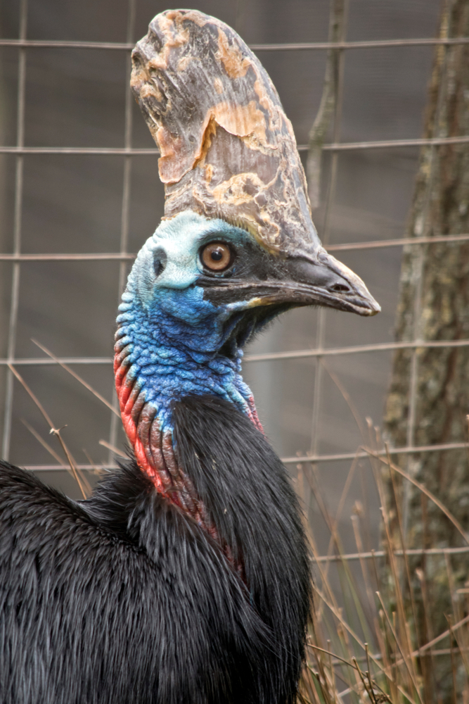 引人注目的是,食火鸡的脸部呈深湖蓝,脖子上挂着两个红色的大垂肉(皮肤的褶片),头上戴着一顶被称为“安全帽”的空心“头盔”,呈现半扇状,高而侧扁,当它们横冲直闯时,可以排除挡路的树枝。这些高耸起来的坚硬角质盔,还会随着食火鸡的年龄增长而逐渐增高,像恐龙一样,相当霸气。