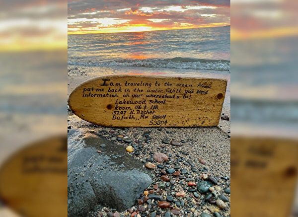 船底部的手写字迹依然清晰可读:“我在航海,请把我放回水里”。并且写有联系地址:明尼苏达州(Minnesota)德卢斯(Duluth)的莱克伍德(Lakewood Elementary School)小学。