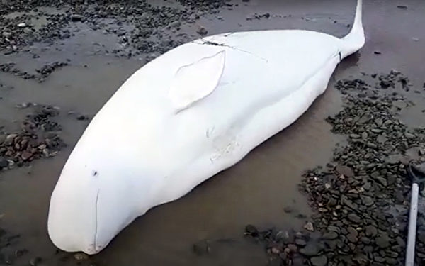 据《西伯利亚时报》报导,这3条白鲸于10月14日在退潮时搁浅在乌第河(River Uda)的出海口,距离大海约1.5公里。其中,白鲸妈妈和小白鲸趴在河床上,相距一段距离,还有另一条成年白鲸在不远之处。