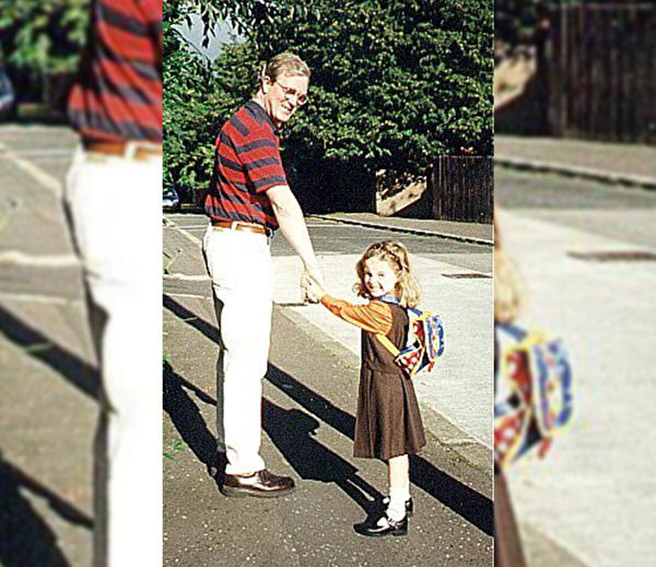 第一张照片摄于1999年9月,当时是妮芙第一天上小学,香农在家门前牵着女儿的手去学校。他向英国广播公司(BBC)回忆说,当天他比女儿还要紧张,同时也为女儿自豪。妮芙当时4岁,身高不及父亲的腰部,满脸稚气。