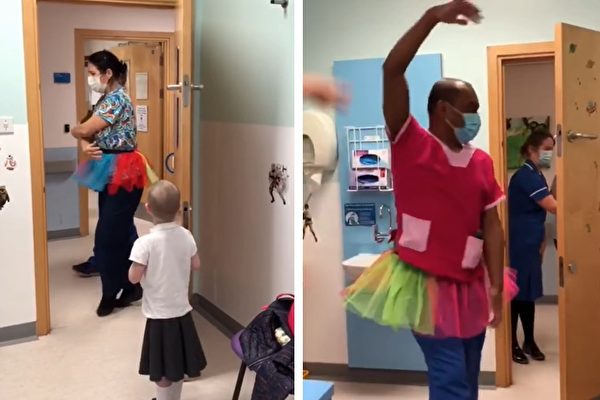 英国一位5岁小女孩正在医院接受第二次癌症治疗。为了让她开心,两名医护人员穿上芭蕾舞裙,举办了一场非常特别的演出,给喜欢芭蕾舞的小患者一个暖心惊喜。