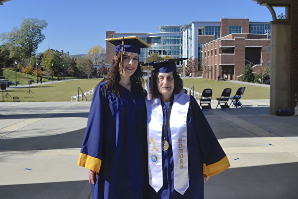 经过三年多的努力,奶奶帕特和孙女梅洛迪终于一起毕业了。在毕业照上,祖孙俩肩并肩站着。