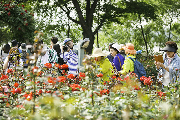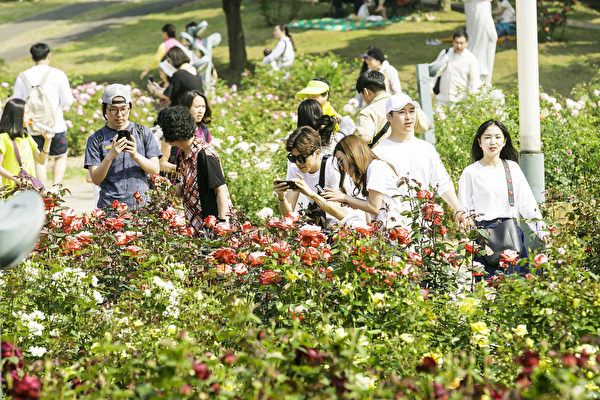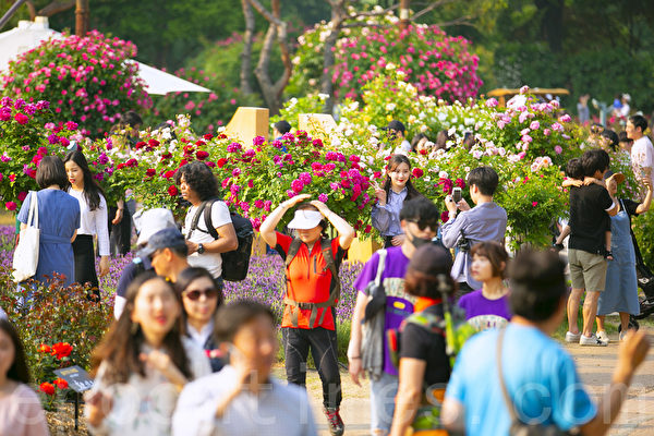 韩国首尔大公园玫瑰节于5月26日开幕,许多民众前往赏花拍照。(全景林/媒体)