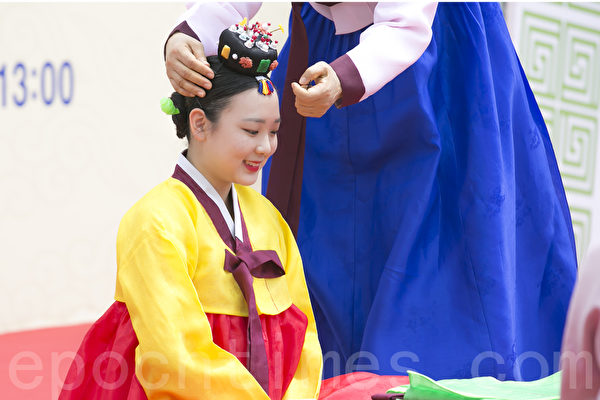 在冠礼中,长辈会为男子戴上一顶黑色礼帽。而在笄礼中,长辈会为女子盘起头发,插上一根簪子,戴上一顶彩色小帽,最后换上另一颜色和款式的韩服。