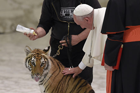 2016年6月16日,梵蒂冈保罗四世大厅,教宗方济各在会见世界旅行表演50年活动参与者时抚摸一头年轻的老虎。(ANDREAS SOLARO/AFP)