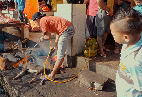 还有摊贩将小狗活活打死,再以火焰整只烧烤,然后陈列在桌上出售,而这些小狗的脸上甚至还带着痛苦的表情,令人不忍卒睹。